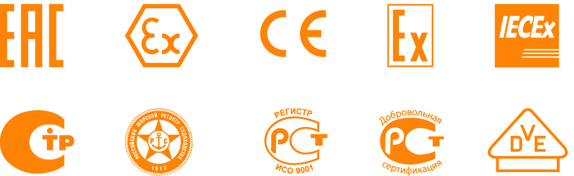 Высокое качество производимой и поставляемой нами продукции подтверждается соответствующими сертификатами, а также отвечает всем российским и международным требованиям по взрыво-, электро- и пожаробезопасности. Большинство изделий сертифицировано для применения во взрывоопасных зонах. Вся продукция имеет гарантийный срок в соответствии с типом продукции.