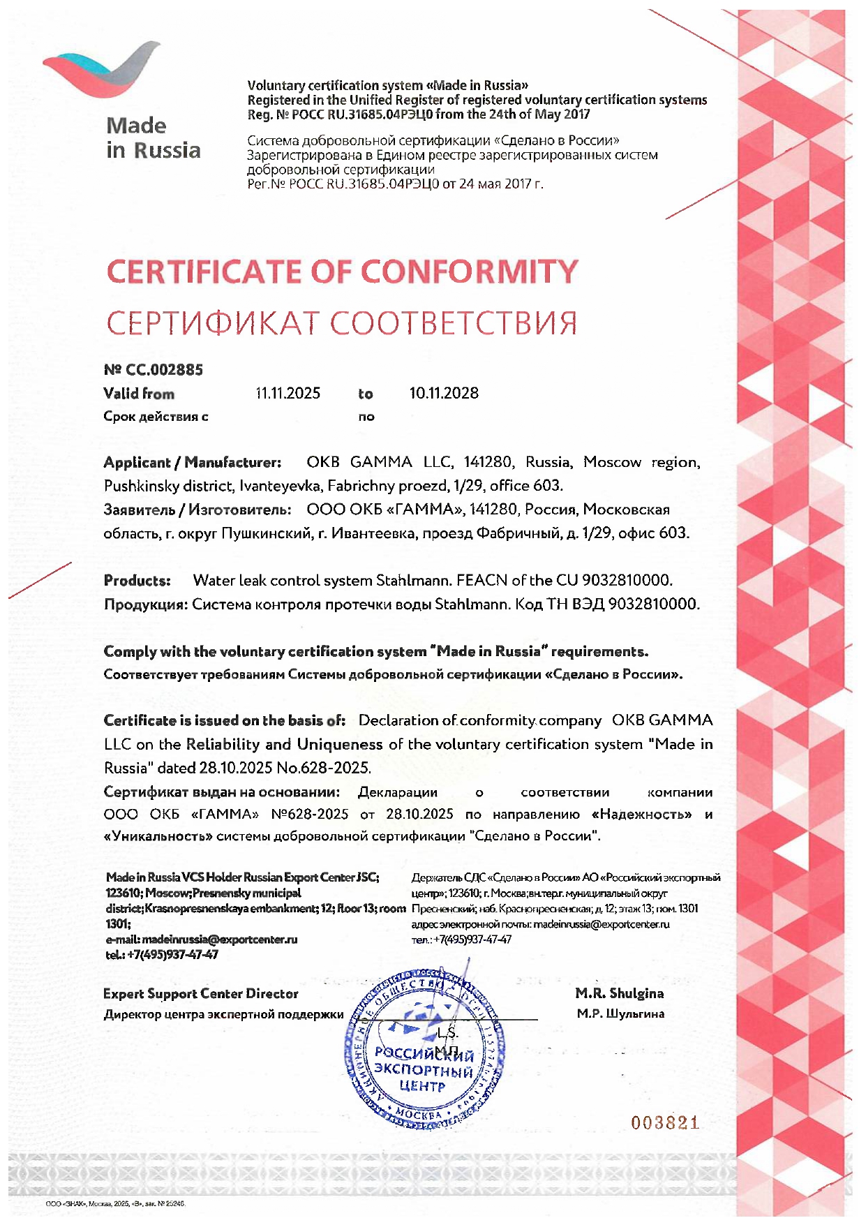 ОКБ «Гамма» (входит в Группу компаний «Специальные системы и технологии») — один из ведущих в мире производителей компонентов систем электрообогрева и разработчик комплексных решений безопасности — сообщает о значимом достижении: система защиты от протечек воды Stahlmann™ успешно прошла добровольную сертификацию и получила сертификат соответствия «Сделано в России» по направлениям «Надежность» и «Уникальность». Это событие подтверждает не только отечественное происхождение продукции, но и ее соответствие строжайшим отраслевым и международным стандартам.